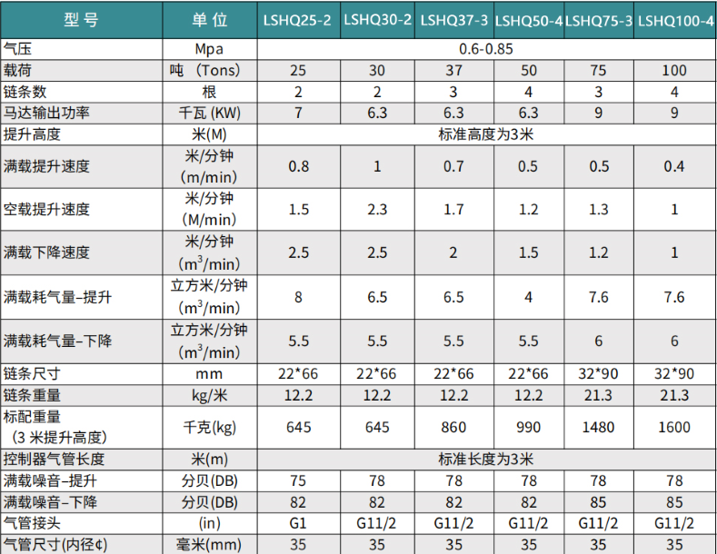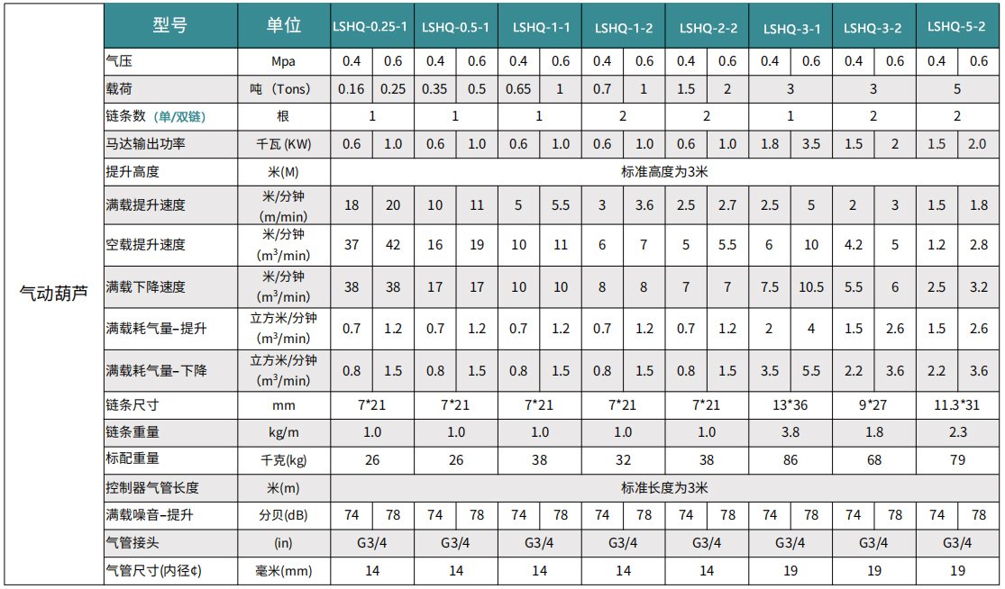 LSHQ型氣動葫蘆介紹: 【產(chǎn)品名稱】LSHQ型氣動葫蘆 【產(chǎn)品品牌】龍升品牌 【產(chǎn)品規(guī)格】0.25-100T 【產(chǎn)品保質(zhì)】保質(zhì)2年 【產(chǎn)品來源】氣動葫蘆 【產(chǎn)品定制】鏈條可定制鍍鋅材質(zhì)可定制100級 、鏈條長度可加長、可定制銅質(zhì)上下吊鉤 【典型應(yīng)用】適用于船廠,化工廠,高溫粉塵環(huán)境,紡織廠提升和運輸產(chǎn)品,噴漆車間、油罐儲運等場合。