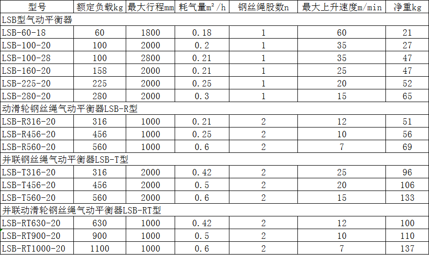 LSB型氣動平衡器優勢: ●LSB型氣動平衡器可24小時不間斷運行 ●LSB型氣動平衡器采用壓縮空氣為動力,無火花運行 ●LSB型氣動平衡器運行速度快,是電動葫蘆的2-6倍 ●LSB型氣動平衡器有斷氣保護,過載保護功能,使用更安全 ●LSB型氣動平衡器具有無級變速功能,可根據吊起重量自由控制上升速度 ●LSB型氣動平衡器具有自使用的“漂浮”功能,當零部件被吊起時處于“無重力"狀態,輕松實現精準定位,實現助力裝配。 ●LSB型氣動平衡器耗氣量極低,平均每個工作循環耗氣量約為0.21m/h,是氣動葫蘆耗氣量的1/50,體積小,無噪音 ●LSB型氣動平衡器單繩60-280kg,速度較快,懸浮距離400mm ●LSB型氣動平衡器并聯316-560kg,雙機并聯承載力大一倍,行程不變 懸浮距離不變 ●LSB型氣動平衡器動滑輪316-560kg,單機雙繩承載力大一倍,行程縮小一倍,懸浮距離200mm ●LSB型氣動平衡器動滑輪并聯630-1100kg,雙機四繩,承載力大兩倍,行程縮小一倍,懸浮距離200mm,適合重型設備及工件搬運安裝作業 LSB型氣動平衡器實物: